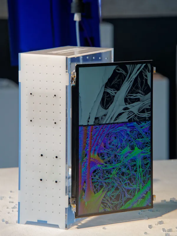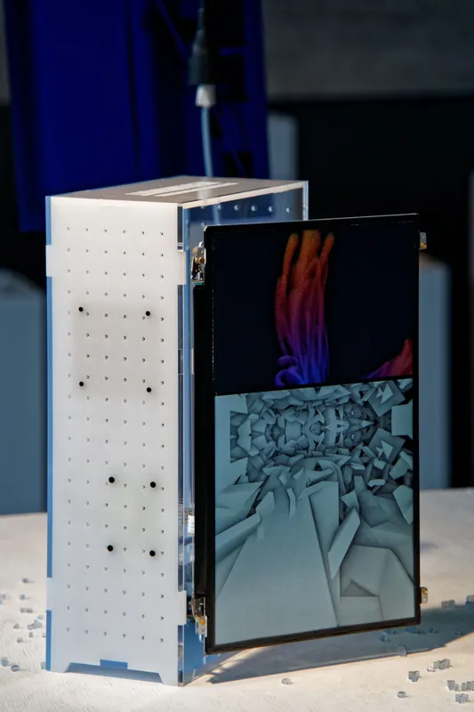 A digital sculpture with fractal painting animation generated in real time.