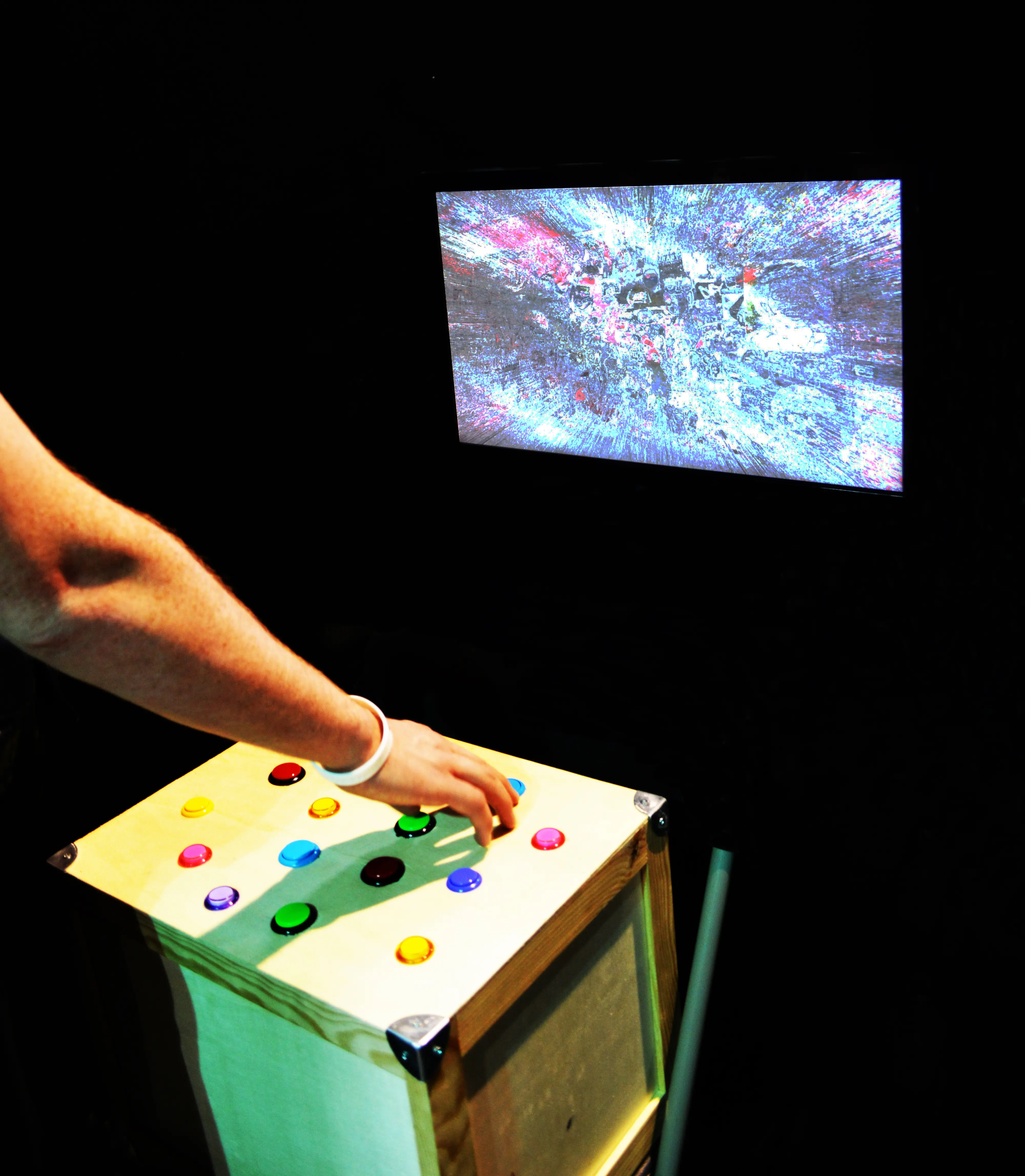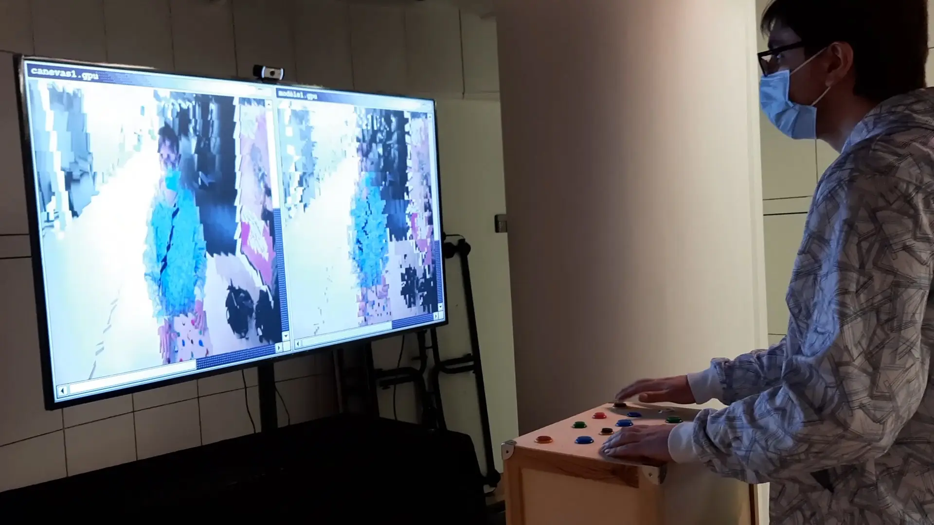 GPU is a puzzle game-installation that challenges players to interact with their own distorted reflections. Using a custom enigmatic gamepad, players navigate the feedback of a live camera feed displayed on a screen. The screen shows two versions of their image: one is clear and unaltered, while the other is glitched and transformed by video effects. Manipulate the cryptic controller to match the altered image, exploring and decoding the controller's functions to solve the puzzle. Can you decipher the glitches and perfect your digital double?
