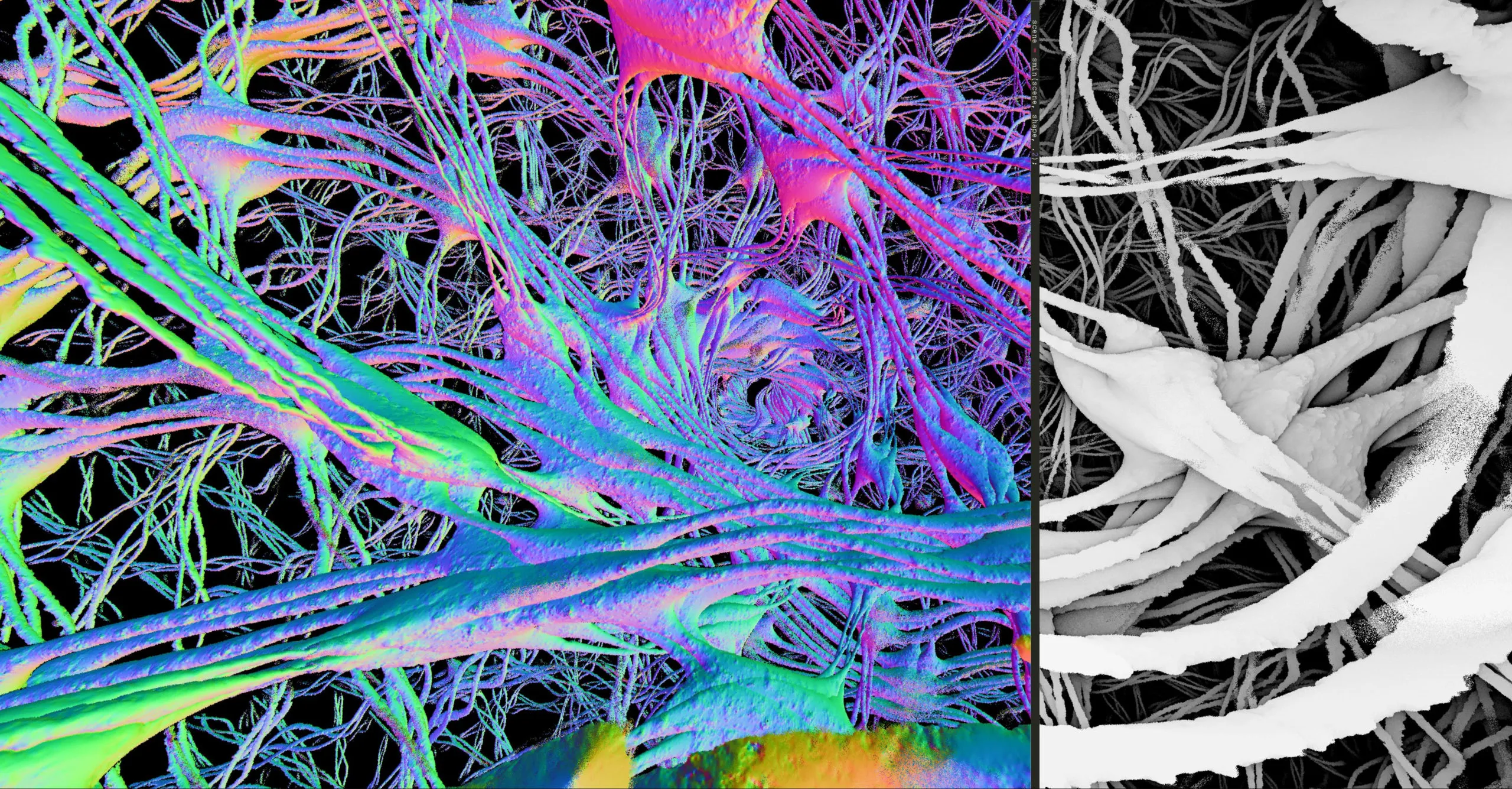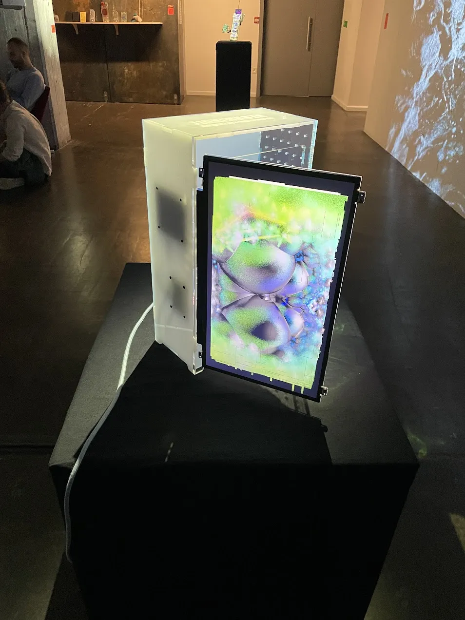 Reflecting a computer tower, the screen facade opens like a portal, inviting the viewer to approach the heart of the machine. The screen and the central processing unit become one. It forms a digital sculpture on which content calculated in real time is displayed. Generated by graphic code, the screen projects fractal animations.