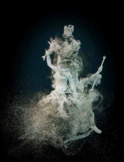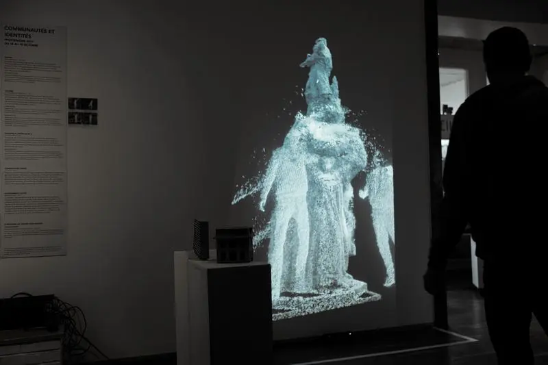Colonia is an interactive device that asks the user to assume the position of a figure projected onto the screen. Once the figure has been reproduced, the user enters a digital space where their body is projected in front of a statue. They can then interact with the statue by positioning their body inside it. Each movement agitates the point cloud and recreates an abstract tableau combining the two bodies, that of the statue and that of the user. Then the device returns to its initial state and proposes another silhouette.